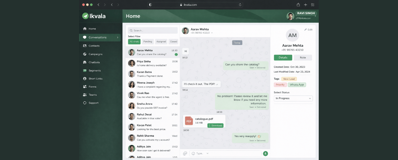 Ikvala delivers a comprehensive suite of WhatsApp business solutions, including CRM integration, automated messaging workflows, audience segmentation, multi-agent inbox management, real-time campaign analytics, and end-to-end lead monitoring — all designed to enhance customer engagement and operational efficiency.